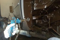 После того, как специалист закончил свою работу по заполнению всех мелких трещин и щелей, он проходит по всем отверстиям и потом для обработки ходовой части он применяет уже другую распыляющую насадку и распыляет состав на всю ходовую часть днища (шасси).