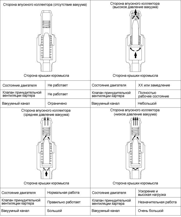 Принцип работы клапана вентиляции картерных газов основан на перепаде давления. За счет этого механизм может находиться в 4 положениях: