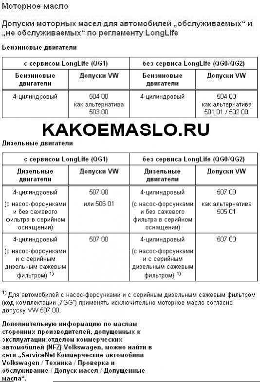 VW 507.00 – Масла для бензиновых и дизельных двигателей с увеличенным сервисным интервалом, включая дизельные двигатели с сажевым фильтром и без дополнительных присадок в топливе. Альтернатива – VW 505.01, VW 506.00, VW 506.01. Исключение двигатели R5 TDI (2,5 л) и V10 TDI (5 л), требующие только VW 506.01.