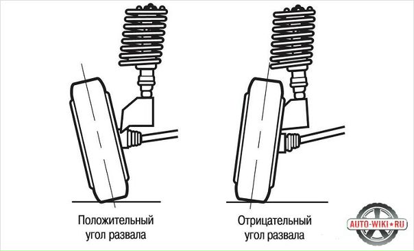 Развал это отношение расположения плоскости колеса к вертикальной оси. Существует три вида: отрицательный, положительный и нулевой. Если верхнее окончание колеса направлено внутрь, то это считается отрицательным развалом. Улучшает маневренность автомобиля в поворотах. Внутренняя часть покрышек изнашивается больше. Меньшее пятно соприкосновения способствует ухудшению управляемости при прямолинейном движении. Развал с положительным значением наоборот обеспечивает уверенное перемещение по прямой линии, но плохо влияет на маневрирование в поворотах.