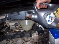 Залейте все необходимые литры масла в двигатель, используя воронку, если необходимо. На рисунке справа показано, как кто-то заливает масло в двигатель.