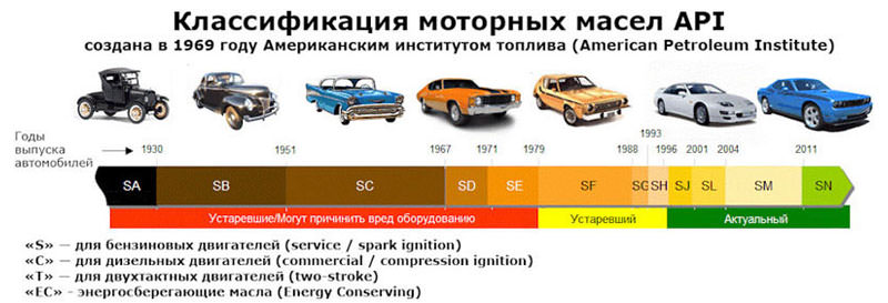 Классы машинных масел для бензиновых двигателей по качеству в зависимости от года выпуска: