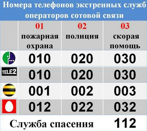 Указанные номера являются одинаковыми для всех мобильных операторов России, также они абсолютно бесплатные. В принципе, по номеру 112 можно звонить в любой другой стране, 102 — это номер милиции в Украине. В США можно набирать 911.