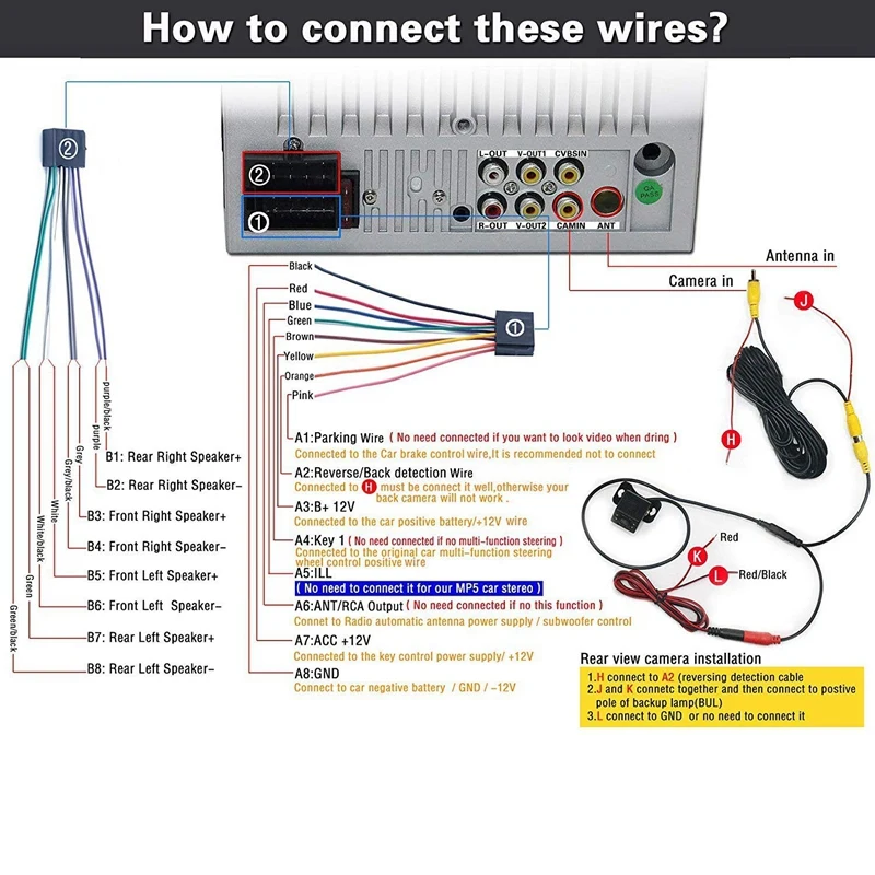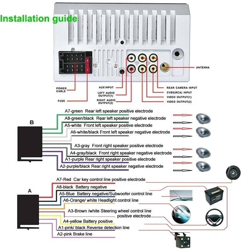 Процесс правильного подключения важен для того, чтобы автомагнитола была правильно подсоеденина к кабелям питания, что обеспечит сохранение настроек при заглушенном автомобиле. Для включения магнитолы 2 din 7018B необходимо подключить всего 3 провода из шлейфа А. Красный, Желтый, Черный.