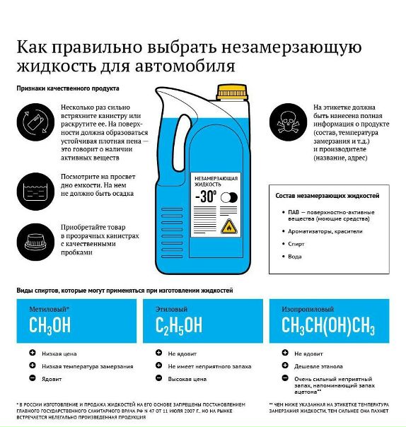- Основой любой незамерзайки становится спирт. Лучше всего покупать омыватели на основе этанола. В этом случае продукт получается без запаха или же аромат не вызывает неприятных последствий. Также безвредным считается изопропанол, но жидкость приобретает более резкий запах. Если в составе присутствует метанол, то от такой незамерзайки лучше отказаться. Кстати, применение метилового спирта запрещено российским законодательством для изготовления автомобильных очистителей.