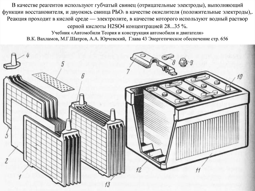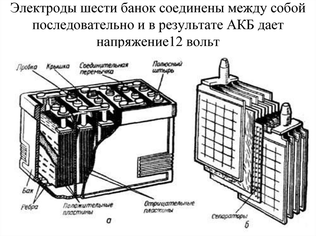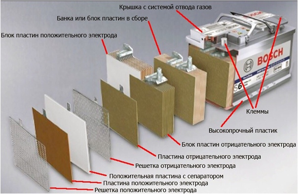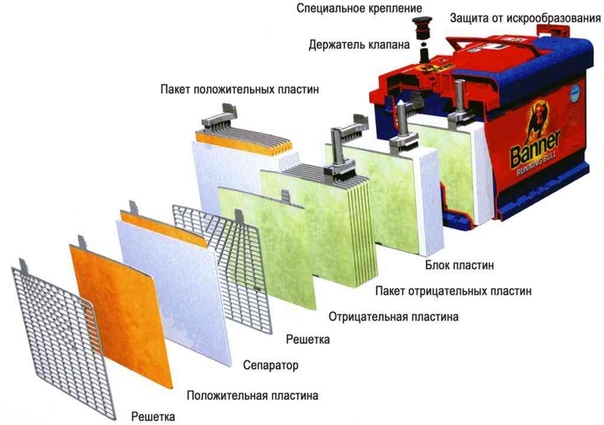 Стандартная 12-вольтовая автомобильная аккумуляторная батарея выполнена из шести последовательно соединенных между собой блоков разноименно заряженных пластин, каждый из которых и представляет собой простейший аккумулятор с выходным напряжением около 2 вольт. Положительно заряженная пластина (электрод) представляет собой свинцовую решетку с активной массой из двуокиси свинца (PbO2), а электрод со знаком минус — решетку с активной массой из губчатого свинца (Pb). Полублоки разноименно заряженных пластин вставляются друг в друга. Во избежание возникновения короткого замыкания между пластинами, их разделяют пористыми сепараторами из изоляционного материала. Собранные блоки помещаются в корпус и заливаются электролитом (раствором серной кислоты плотностью 1.